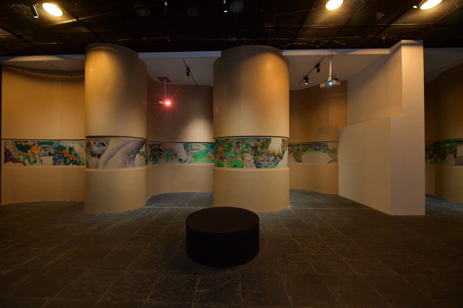 “地洞”一旁是展廳的下沉區(qū)域,這里被策展人設(shè)計(jì)為去往“桃花源”的實(shí)體路徑。梁碩的《景了個區(qū)》出現(xiàn)在這個下沉空間的一排四個口袋式的連續(xù)隔間墻面上,從空間上來說是無比契合的?;仡櫫捍T2019年在北京公社的展覽《梁碩:景區(qū)》同樣可以見到這樣一種迂回的觀展路徑?!熬皡^(qū)”這個概念的提出,在藝術(shù)家看來代表著今天人們對山水的理解,這個獨(dú)特的概念跨越了自然景觀與都市空間。梁碩在自己撰文的《景了個區(qū)》中復(fù)原了一個景區(qū)籌備建立起來的小故事,承包景區(qū)改造的劉工在工期接近尾聲時,看到自己的“杰作”時不由感嘆:“這些水泥造物,居然都妥妥的在那了,像是本來就是從山里長出來的,那巨大的假山石和假樹根顯得造型怪異,卻頗得陳老蓮氣韻,在落日的余暉中與真山融為一體,真山也像了假山……”[6]景區(qū)的建立勢必意味著人工、商業(yè)、消費(fèi)對自然景觀的直接侵入與改造,空間、審美、意識形態(tài)等一系列問題由此發(fā)生。
