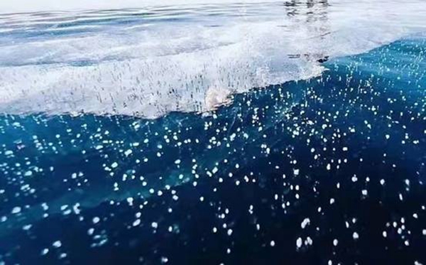 “冰泡”是由湖底植物釋放出的沼氣(甲烷)在上升過程中,因極寒氣溫導致冰封速度過快,被“鎖”在冰層之中而形成。目前,全世界僅有3個著名的冰泡湖,北極漠河冰泡湖是中國最北唯一的“冰泡奇觀”。觀音山“冰泡”晶瑩剔透、造型奇特、惟妙惟肖,有的形似“飛碟”一飛沖天,有的形似“珊瑚”美輪美奐,有的形似“觀音”端坐蓮臺。形態(tài)各異的“冰泡”形成一幅幅精美的冰雪藝術畫卷,成為漠河冬季最火爆的網(wǎng)紅打卡地。
