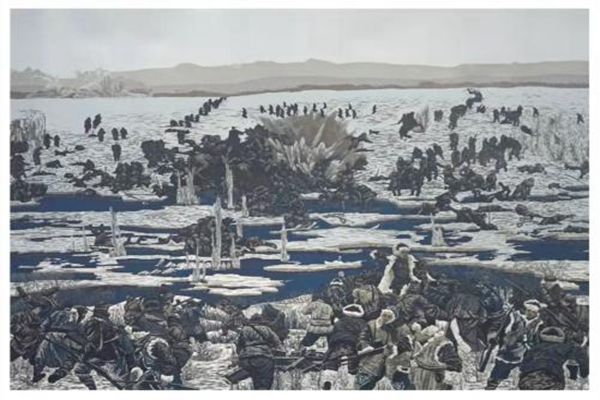版畫作品《冰趟子戰(zhàn)役中的趙尚志》實景再現(xiàn)了東北抗日聯(lián)軍殲敵最多的著名戰(zhàn)役一一冰趟子戰(zhàn)役,展現(xiàn)了趙尚志同志指揮若定、英勇殲敵的英雄形象??孤?lián)戰(zhàn)士借助冰趟子封凍這一東北地區(qū)特有的有利地形,化被動為主動,對尾追日軍進(jìn)行伏擊,殲滅大量日軍。體現(xiàn)了東北抗聯(lián)在極其惡劣的條件下,捍衛(wèi)中華民族的無畏斗爭精神。