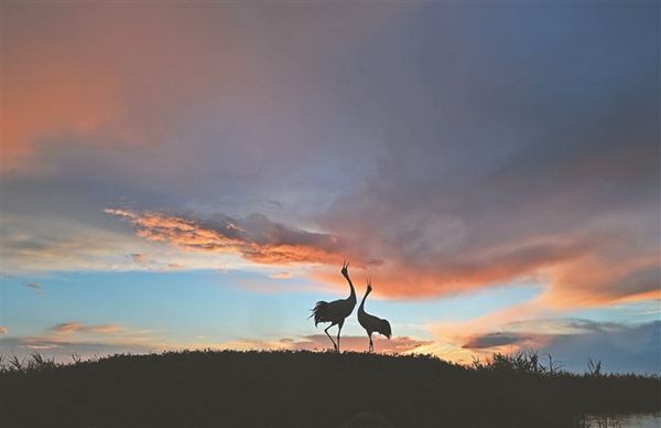 6月,齊齊哈爾市東南26公里處,湖澤密布,葦草叢生,滿目蔥蘢,一群丹頂鶴在天空中展翅翱翔、九霄長鳴。每年6月~8月,是齊齊哈爾扎龍濕地最美麗的時(shí)節(jié)。傍晚,迎著晚霞,曲項(xiàng)向天,引吭高歌,一幅美麗的山水畫卷盡收眼底。