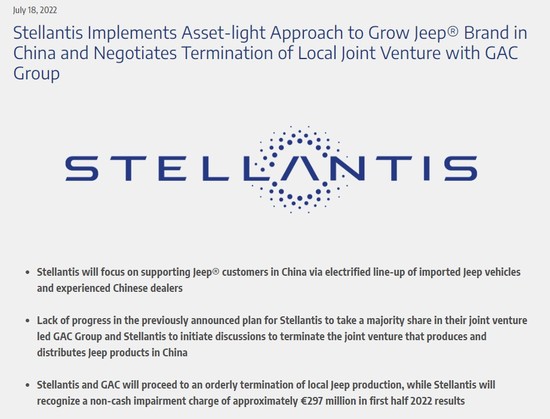 7月18日,Stellantis集團發(fā)布公告稱,正在與廣汽集團協(xié)商終止合資公司廣菲克的經(jīng)營,并將有序停止Jeep品牌的國產(chǎn)化;未來,Stellantis將通過進(jìn)口的方式獨自在中國銷售、經(jīng)營Jeep產(chǎn)品。