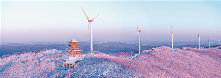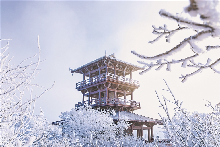 山林間云霧彌漫,白雪和蒼勁的虬枝映襯,山頂?shù)奶煊娱w和一個(gè)個(gè)白色巨人般的發(fā)電“風(fēng)車”相映成趣,將這座名山裝扮得更加素雅、更顯活力。近處,松柏全都凝霜掛雪,戴銀披玉。山頂原始次森林中,低矮的灌木叢也被積雪覆蓋,成為了一朵朵五彩的冰花。高大的樹(shù)木被輕盈的雪花點(diǎn)綴,晶瑩剔透,仿若玉樹(shù)瓊枝,隨風(fēng)搖擺,宛如仙境。