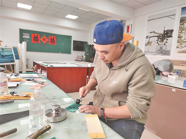 慶安版畫是黑龍江省非物質(zhì)文化遺產(chǎn)代表性項目,始于20世紀(jì)初。創(chuàng)始人吳盡臣將河北樂亭的木刻技藝帶到這片黑土地,最初以雕刻門神、福字等民俗圖案為主題,突出節(jié)日的喜慶和吉祥氣氛,表達人們對美好未來的企盼和追求。20世紀(jì)60年代中期,幾位著名的北大荒畫家到慶安工作,精心指導(dǎo)民俗年畫作者創(chuàng)作版畫,將慶安民俗版畫和北大荒版畫創(chuàng)作相互交融。歷經(jīng)四代傳承,吳蔚的父親吳玉林將題材拓展,用細(xì)膩刀法展現(xiàn)慶安的春播秋收、田園生活,在傳承中不斷創(chuàng)新;而吳蔚則把冰雪元素融入版畫創(chuàng)作,將千里冰封的壯美轉(zhuǎn)化為木板上的立體紋理?!袄献孀诹粝碌募妓嚥荒軄G,但作品題材和技法也要與時俱進,推陳出新?!眳俏当硎?,他們的創(chuàng)作團隊不僅深入田間地頭、林海雪原采風(fēng),用刻刀記錄黑土地的獨特風(fēng)情,也緊盯時事熱點,呈現(xiàn)新時代的主流價值。