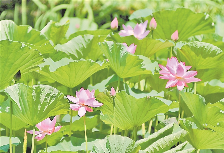 7日迎來小暑節(jié)氣,此時(shí)節(jié)也正是荷花盛放之時(shí)。哈爾濱市道里區(qū)雨陽(yáng)公園內(nèi),碧綠的荷葉鋪滿池塘,含苞待放的花蕾在風(fēng)中搖曳,粉色的荷花競(jìng)相綻放。
