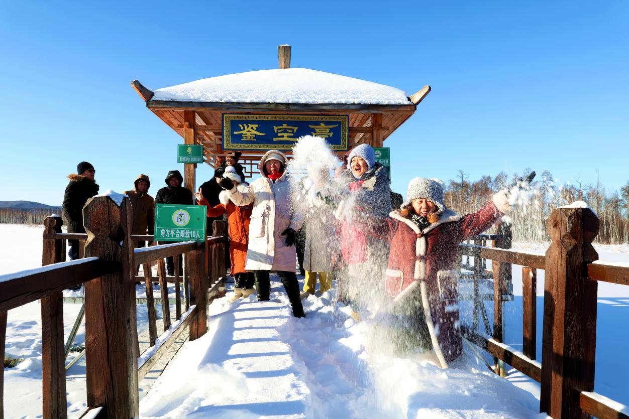 黑龍江省詩詞協(xié)會(huì)采風(fēng)團(tuán)成員在雙妃湖親身感受冰雪文化和驛站文化(王力 攝)