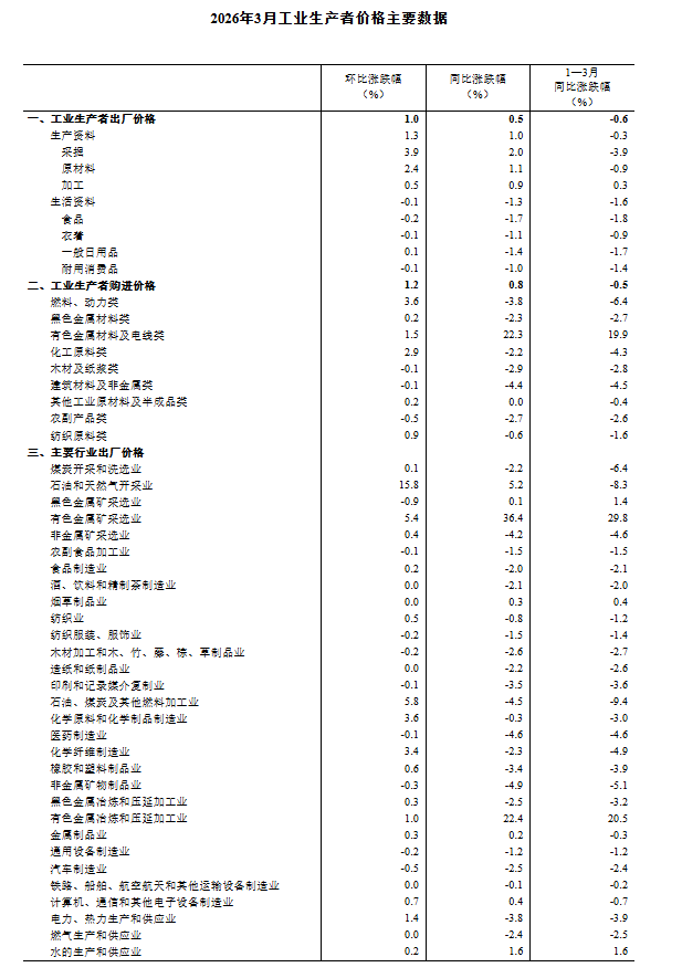 2026年3月份,全國工業(yè)生產(chǎn)者出廠價格同比由上月下降0.9%轉(zhuǎn)為上漲0.5%;環(huán)比上漲1.0%,漲幅比上月擴大0.6個百分點。工業(yè)生產(chǎn)者購進價格同比由上月下降0.7%轉(zhuǎn)為上漲0.8%;環(huán)比上漲1.2%,漲幅比上月擴大0.5個百分點。一季度,工業(yè)生產(chǎn)者出廠價格比上年同期下降0.6%,工業(yè)生產(chǎn)者購進價格下降0.5%。